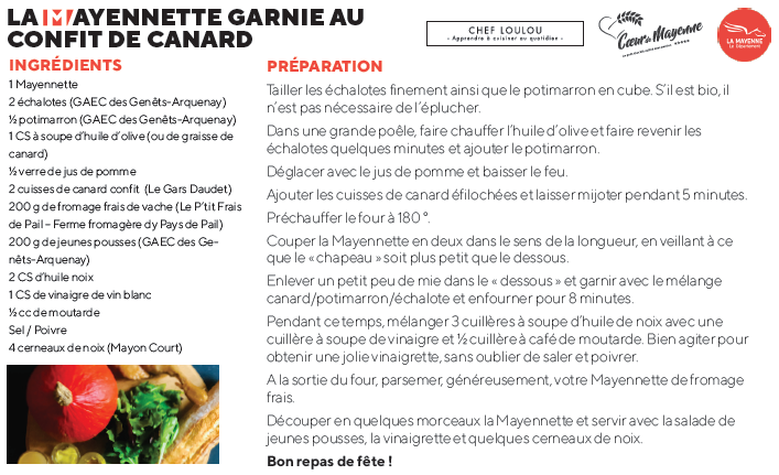 Elle a ainsi eu à cœur de créer une recette inédite et conviviale, facile à reproduire chez vous : la Mayennette garnie au confit de canard, potimarron et salade de jeunes pousses de noix !
